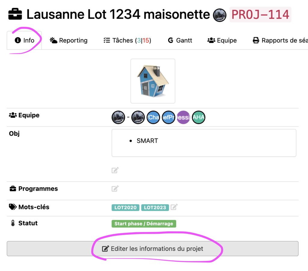 Depuis le tableau de bord projet, cliquer sur l’édition de la fiche projet :