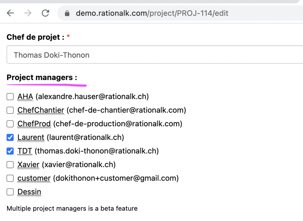 Puis dans le formulaire chercher le champs : Chefs de projets / Project managers :