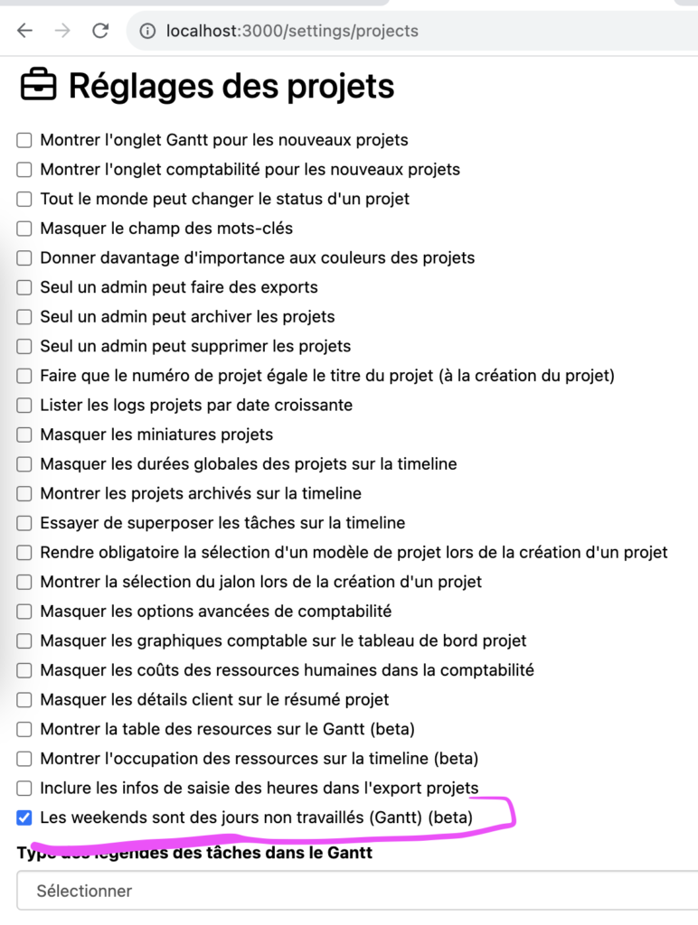 L’admin doit cocher dans l’application “Les weekends sont des jours non travaillés”. Cela se fait dans “Réglages” > “Réglages des projets”.