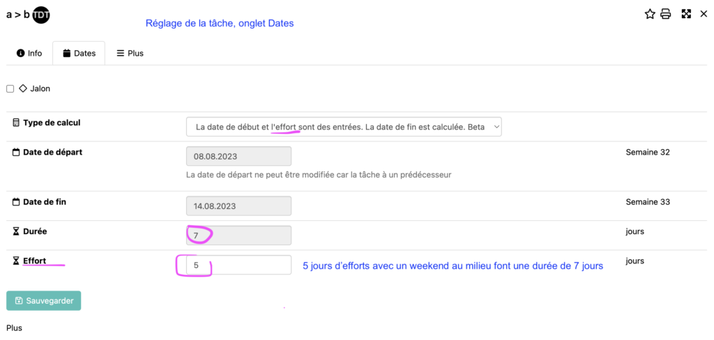 Si l’on veut planifier une tâche en prenant en compte les weekend non travaillés, il faut passer le mode de calcul de la tâche en mode : “début+effort” au lieu de “début+durée”