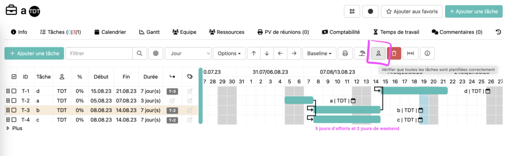 Pour éviter des bugs dans le Gantt, il est conseiller de cliquer de temps en temps sur le bouton de « Vérification de Gantt » :