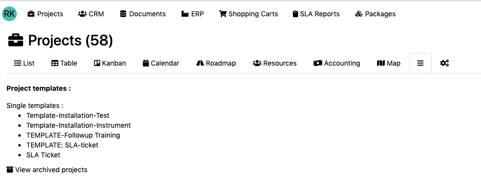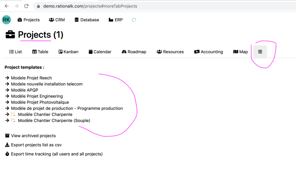 - Le projet disparait de la liste des projets et devient accessibles ici : « Liste des projets » > « Plus » > « Modèles de projets »