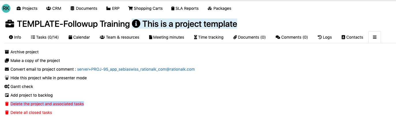 Cliquer sur le modèle de projet, une fois sur le tableau de bord du modèle de projet > onglet avec les trois barres > Supprimer.