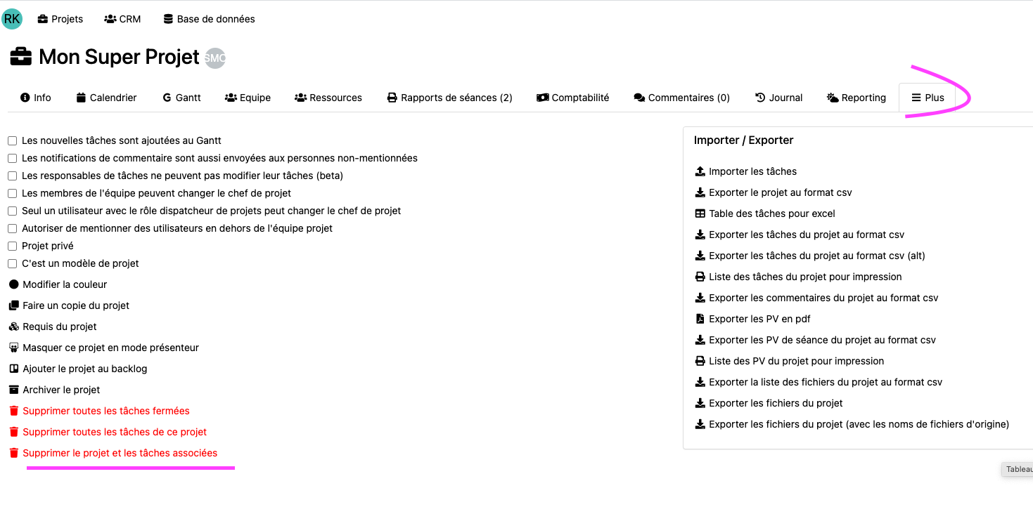 Si l’onglet « Plus », n’est pas disponible dans vos projet, il faut demander à un administrateur d’activer cet onglet sous Réglages > Réglages des projets > Cocher l’onglet « Plus ».