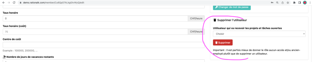 Il faut être admin, aller dans réglages, puis réglages des utilisateurs, puis cliquer sur l’utilisateur, puis en bas à droite supprimer.